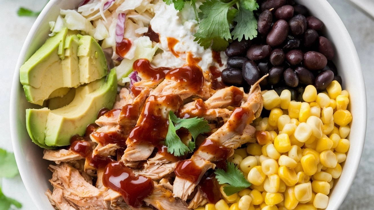 - Color Palette: The vibrant red of the BBQ sauce, the green of cilantro and avocado, and the golden corn make the bowl visually stunning.